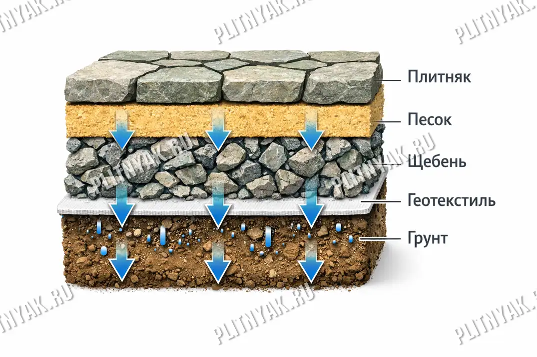 Основание под плитняк всегда состоит из нескольких слоёв, и каждый из них по-своему взаимодействует с влагой. Щебень способен пропускать воду, песок её частично удерживает, грунт может как впитывать, так и задерживать её. Если вода не уходит, она начинает работать против конструкции. Под нагрузкой увлажнённое основание теряет плотность, слои начинают деформироваться, и камень перестаёт опираться на стабильную поверхность.